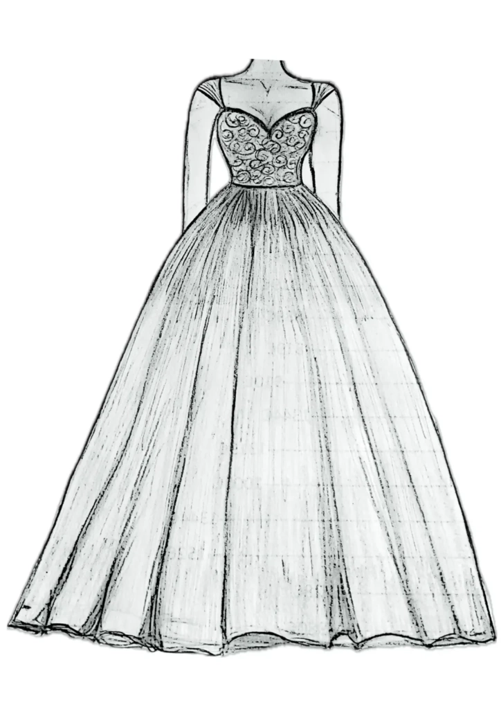La coupe princesse est généralement déconseillée car elle peut accentuer le volume général plutôt que de structurer la silhouette. Mais cela n’est pas une règle absolue. Si la future mariée à un fort souhait de robe princesse, un travail sur-mesure précis peut permettre d’obtenir un rendu équilibré :