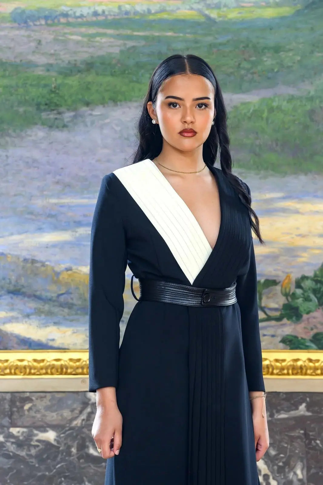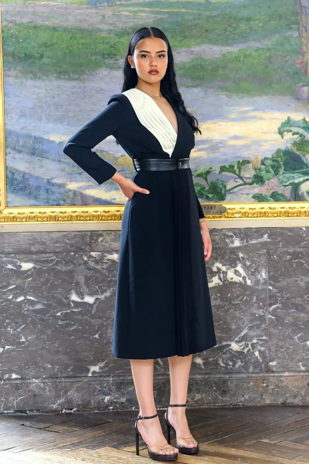 Affirmez votre style avec cette robe tailleur noire au design saisissant. Son col croisé asymétrique orné d’un empiècement blanc crée un contraste graphique ultra contemporain. Cintrée à la taille par une large ceinture à boucle dorée, elle structure parfaitement la silhouette tout en soulignant la féminité. La fente frontale dévoile subtilement la jambe, ajoutant une touche de sensualité assumée à ce look à la fois sobre et audacieux. Une pièce forte, parfaite pour une femme moderne en quête d’élégance et de caractère.