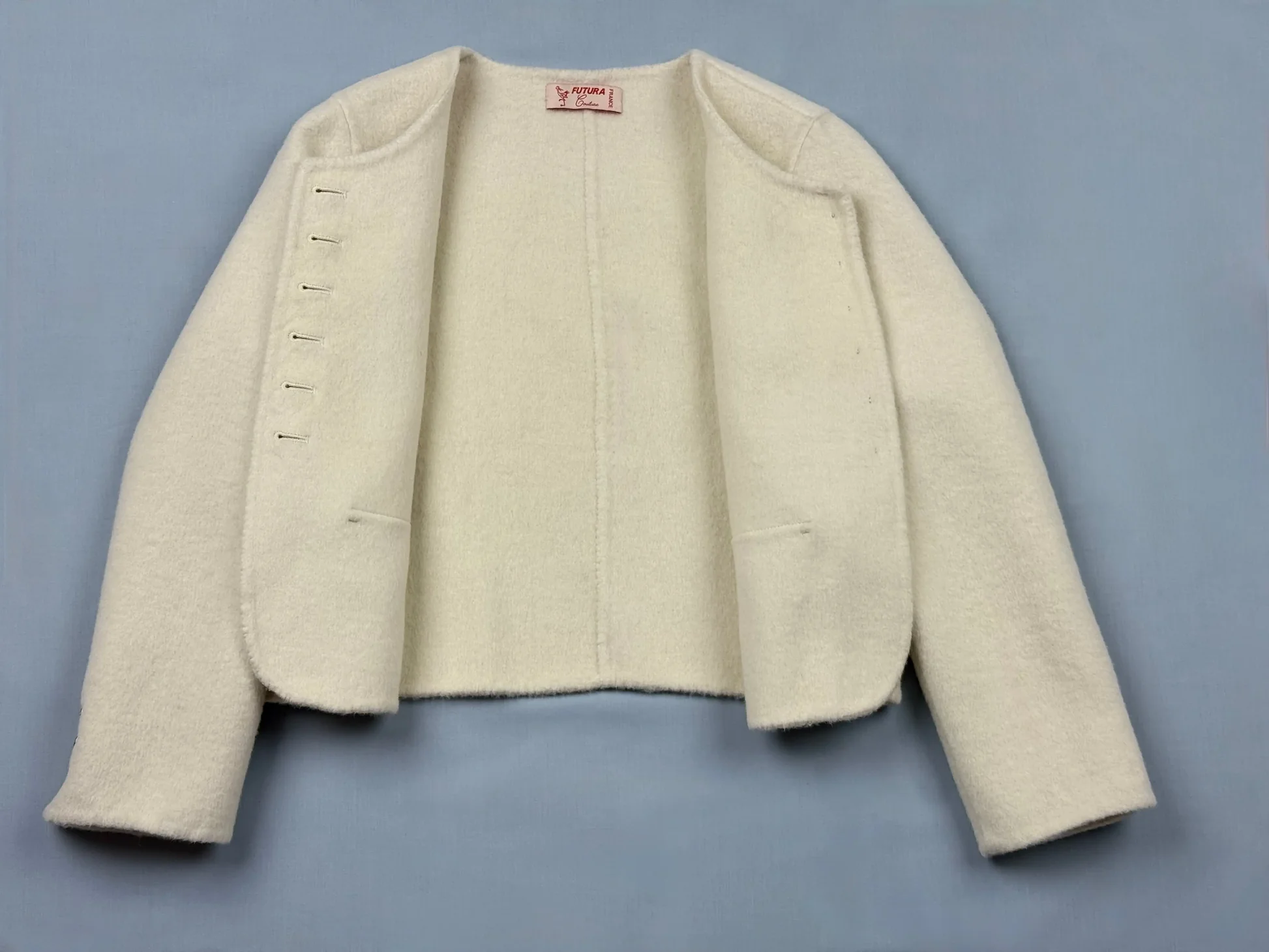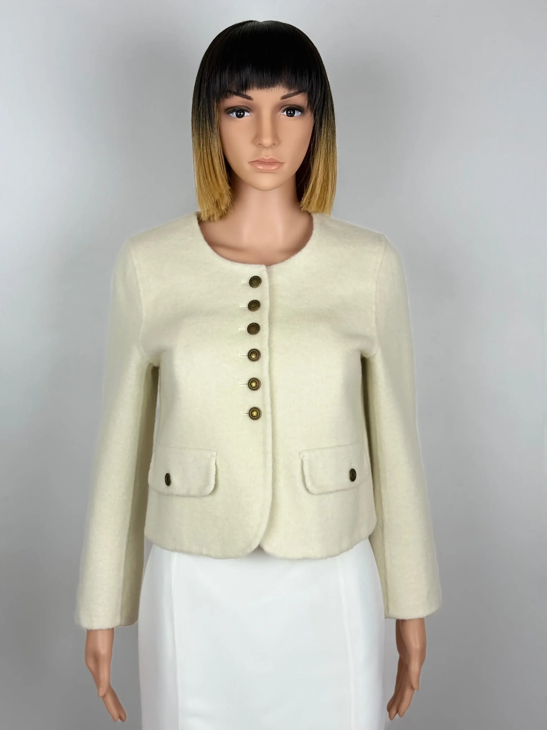 Cette veste courte en tweed écru incarne l’essence du chic parisien. Confectionnée dans un jacquard noble, sa coupe structurée s’arrête juste à la taille pour sublimer la silhouette. Les finitions travaillées – mini-pompons ton sur ton, liserés contrastés et boutons nacrés – apportent une touche délicate et sophistiquée. Idéale pour accompagner une robe élégante ou pour rehausser un tailleur, elle se porte aussi bien en réception qu’en journée habillée.