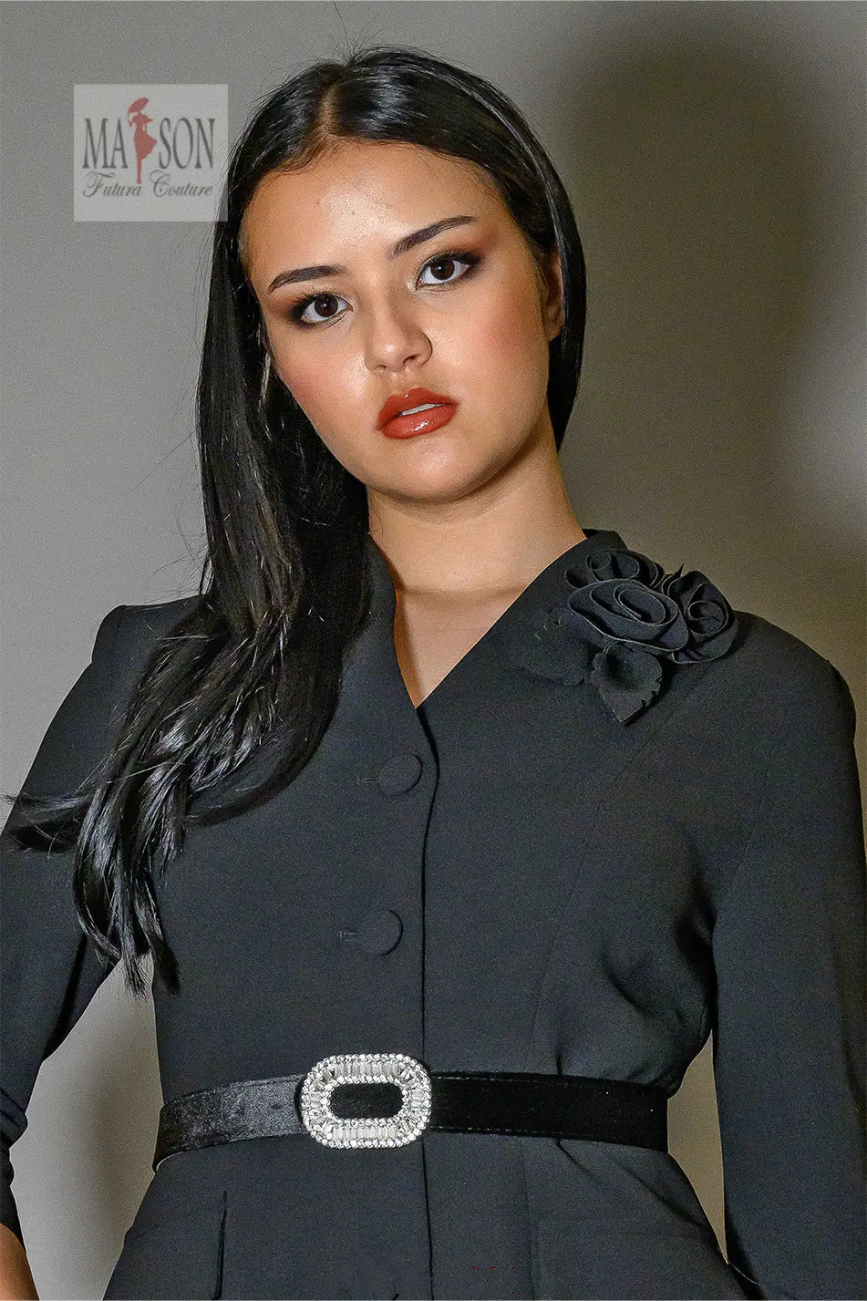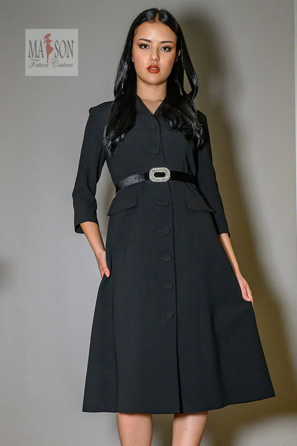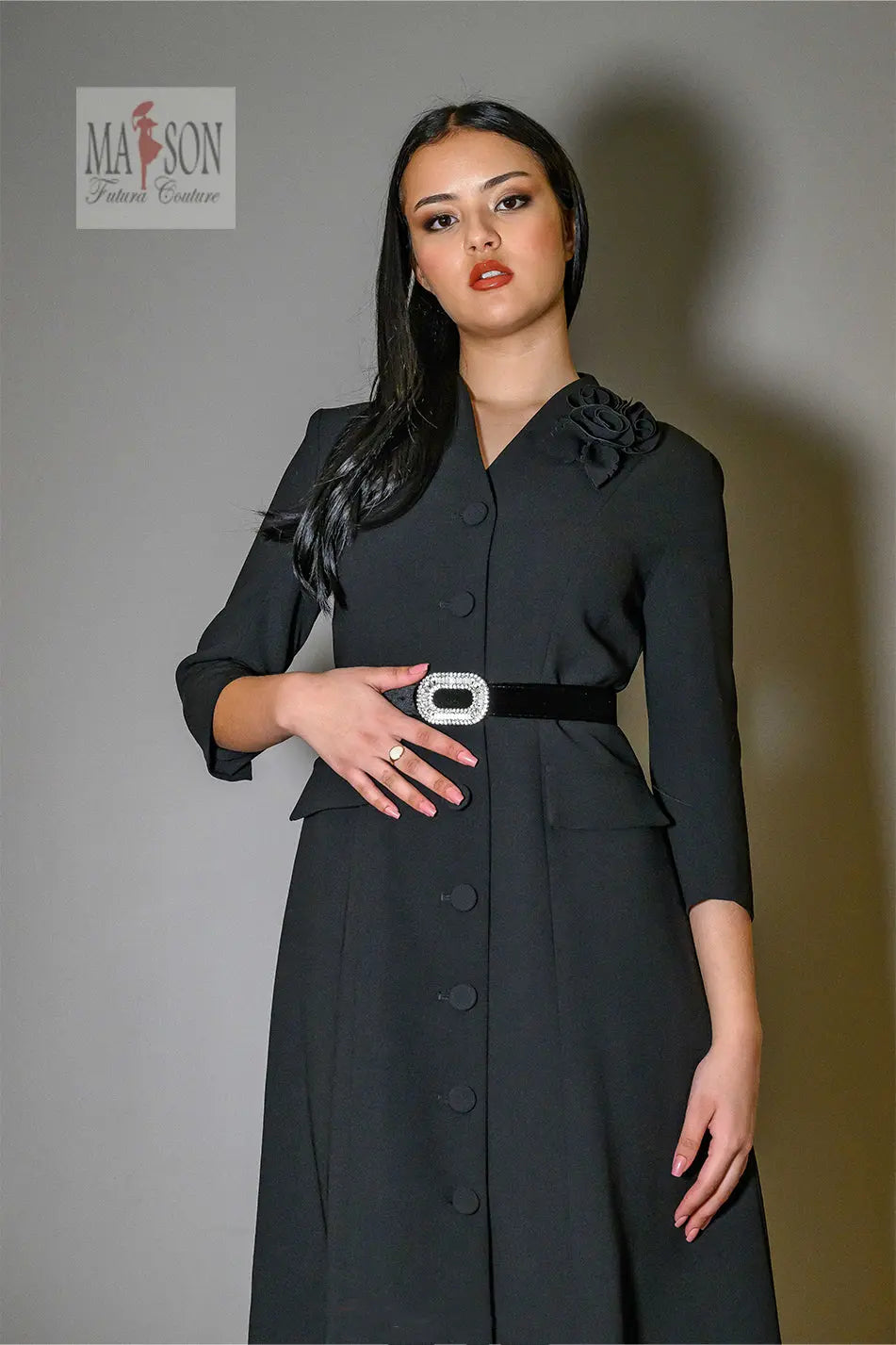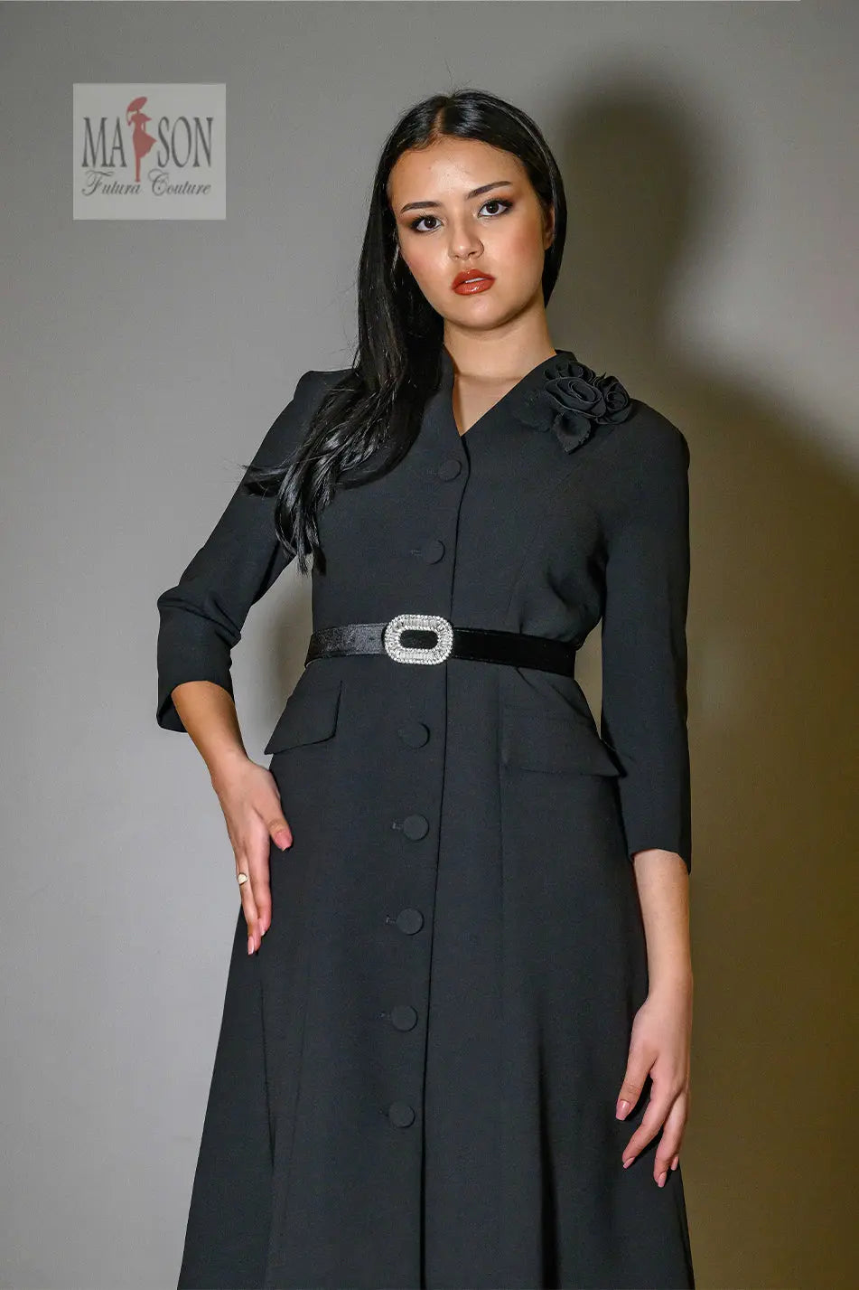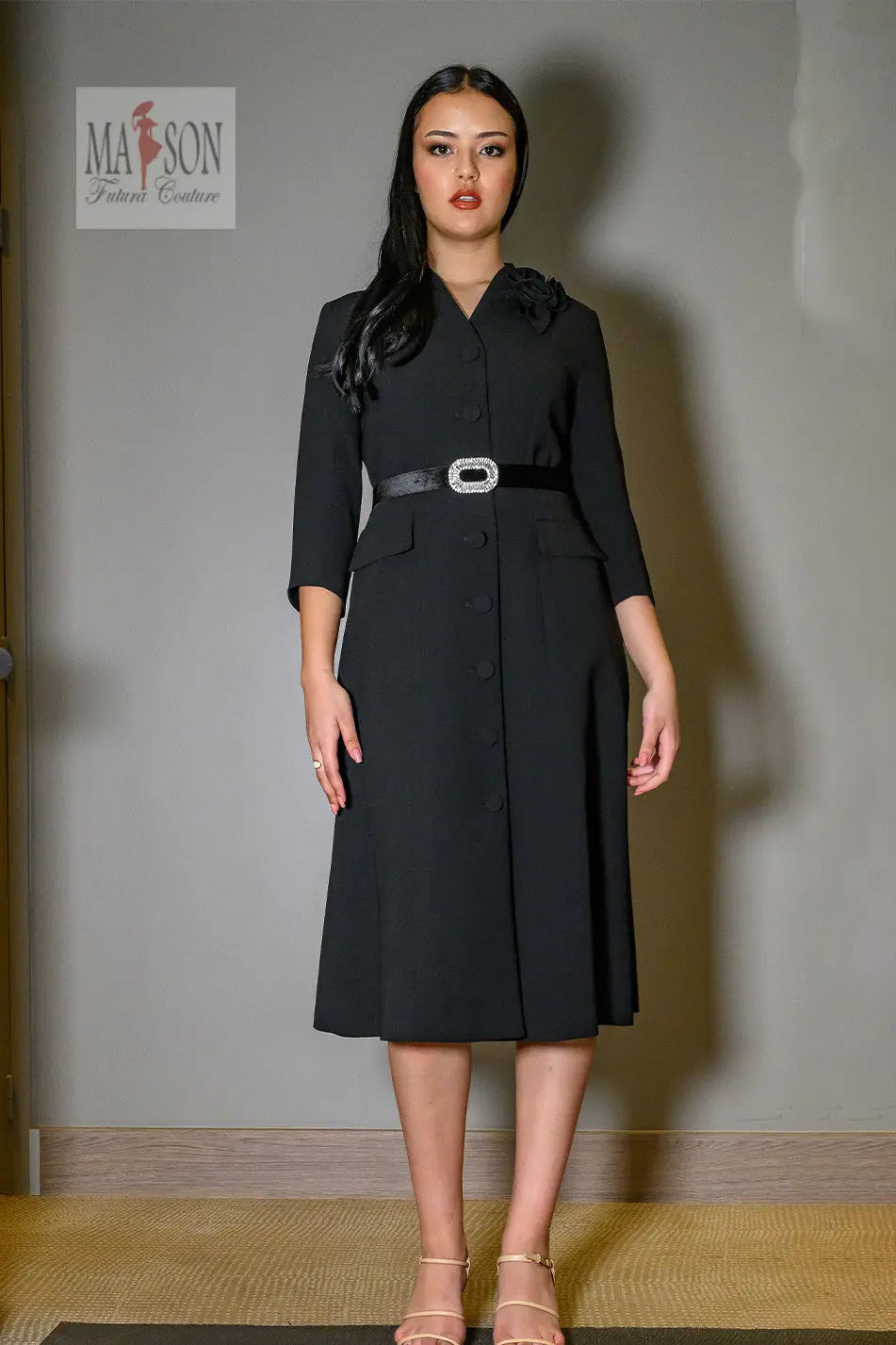 Cette robe tailleur noire incarne le chic intemporel avec une touche de caractère. Sa coupe midi structurée et ses manches 3/4 en font une pièce élégante et polyvalente, idéale pour les grandes occasions comme pour une silhouette distinguée au quotidien. Fermée par une rangée de boutons recouverts, elle est sublimée par une ceinture en velours ornée d’une boucle bijou qui souligne joliment la taille. Un délicat détail floral ton sur ton à l’épaule ajoute une touche de féminité discrète mais sophistiquée.