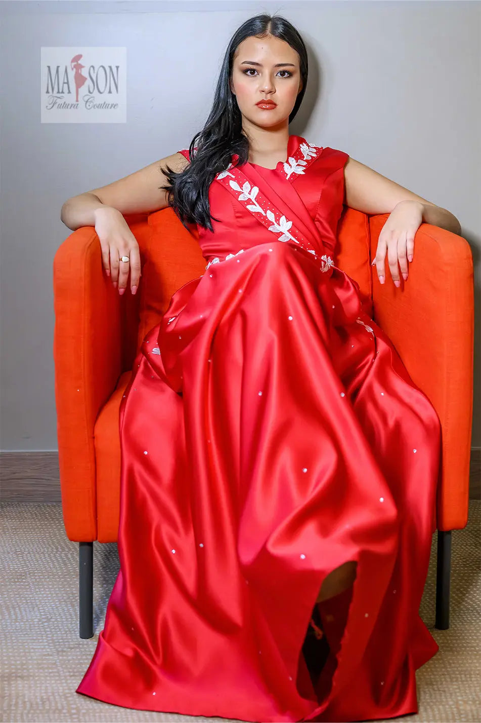 Faites sensation avec cette somptueuse robe de fiançailles longue, confectionnée dans un satin duchesse d’un rouge profond et lumineux. Son décolleté bateau croisé met en valeur la silhouette avec élégance, tandis que de délicates appliques de dentelle blanche viennent rehausser le corsage et la jupe dans un esprit royal. De subtils sequins en cristal captent la lumière à chaque mouvement, apportant un éclat raffiné. Une robe pensée pour une reine du jour, prête à marquer les esprits avec grâce et audace.