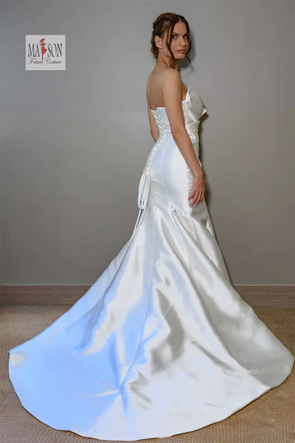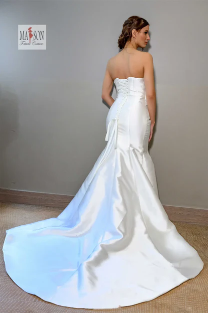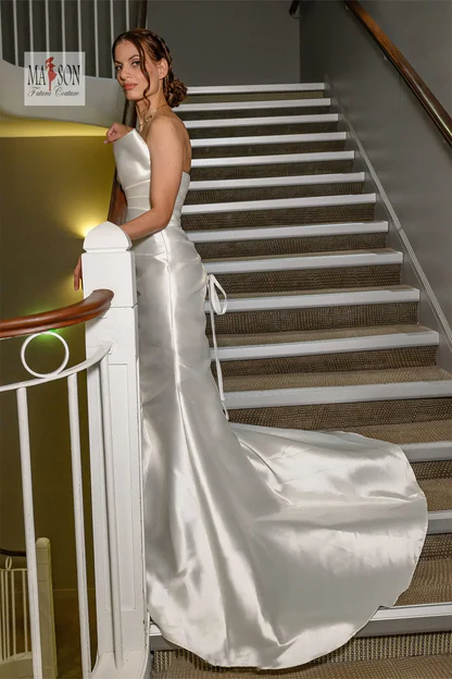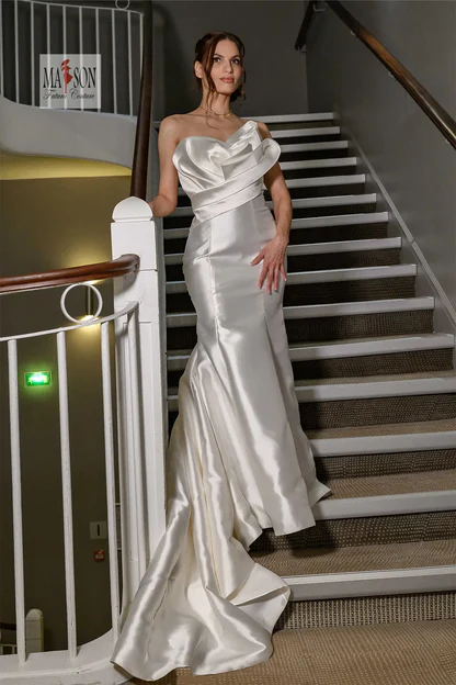 Faites sensation avec cette robe de mariée sirène au design résolument contemporain. Confectionnée en satin lumineux, elle épouse parfaitement les courbes tout en offrant une silhouette allongée et féminine. Le bustier, véritable pièce maîtresse, se distingue par un travail architectural raffiné, mêlant structure et douceur pour un effet couture saisissant. Sa légère traîne ajoute une touche de solennité sans compromettre le confort de mouvement. Une robe idéale pour la mariée audacieuse, en quête d’un style chic, moderne et inoubliable.