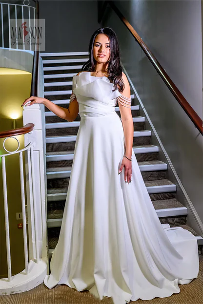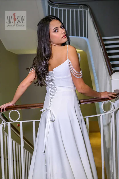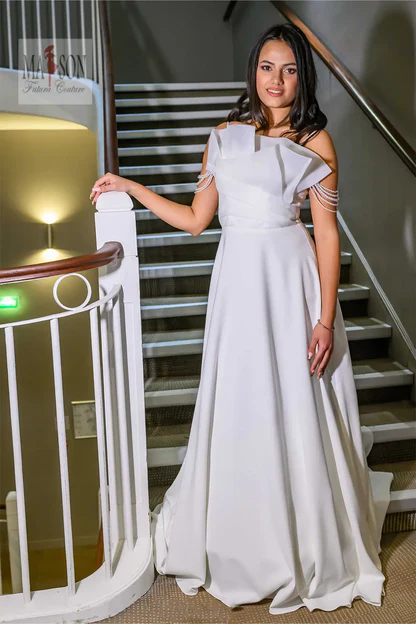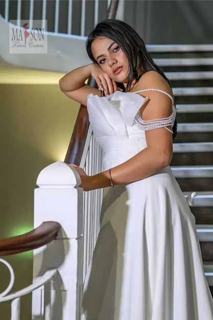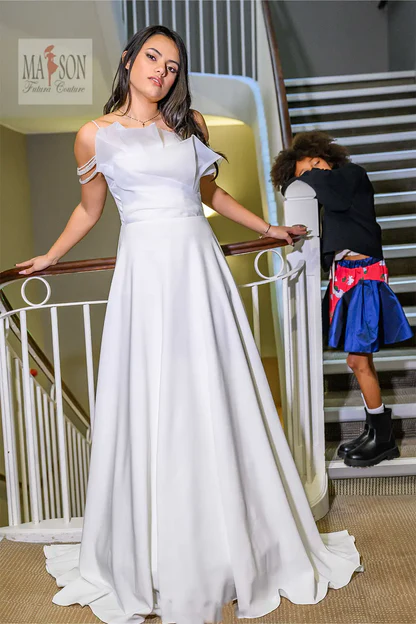 Cette robe de mariée incarne la douceur et la sophistication avec une modernité subtile. Son top bustier revisité séduit par un plissé d’organza délicatement structuré, apportant volume et originalité à l’encolure. De fines bretelles perlées tombent gracieusement sur les épaules, comme un bijou intégré à la robe. Sa jupe en mousseline de soie fluide et aérienne accompagne chaque pas avec une élégance légère. Une création pleine de charme pour la mariée qui cherche à allier grâce, singularité et poésie.