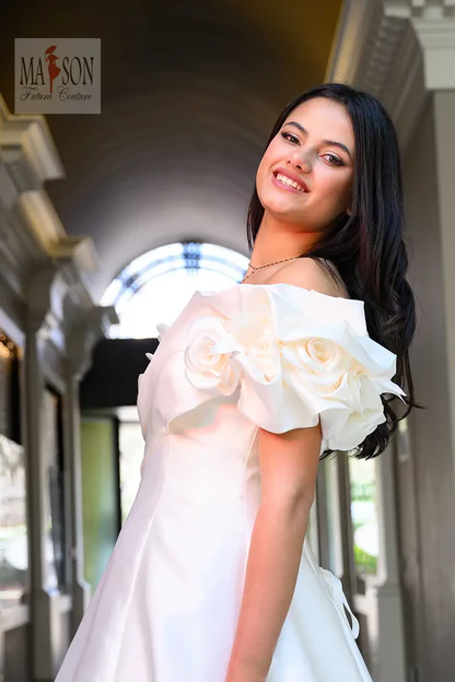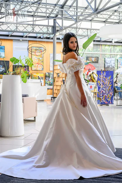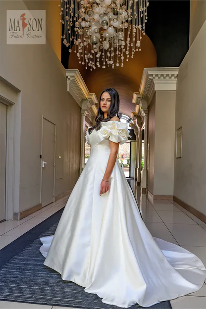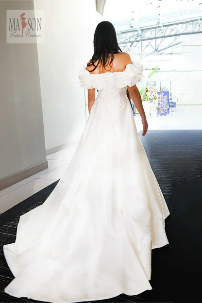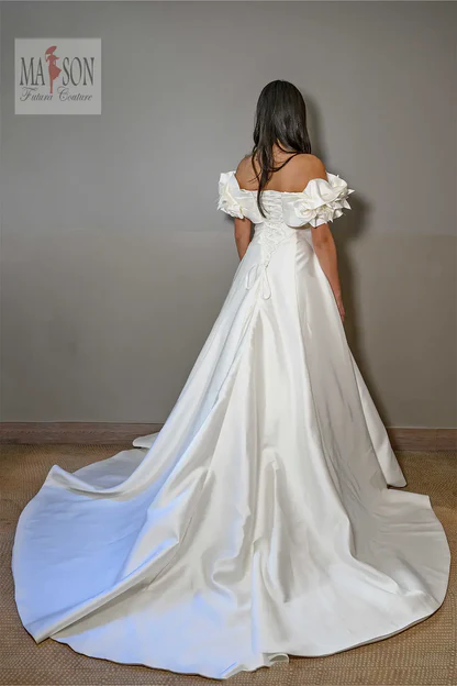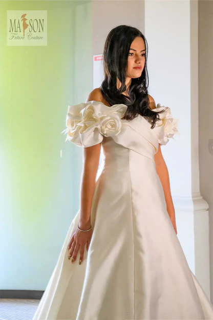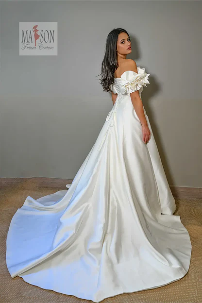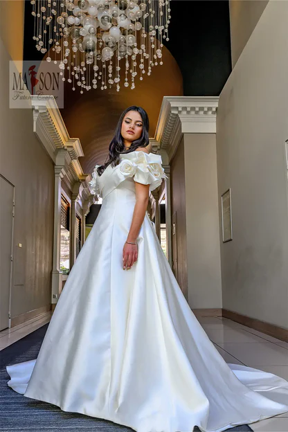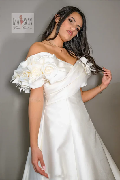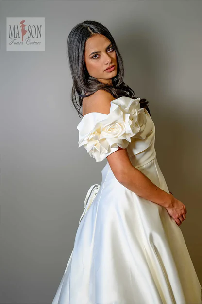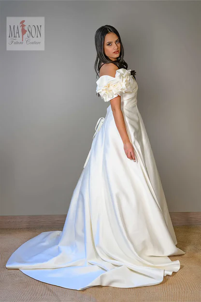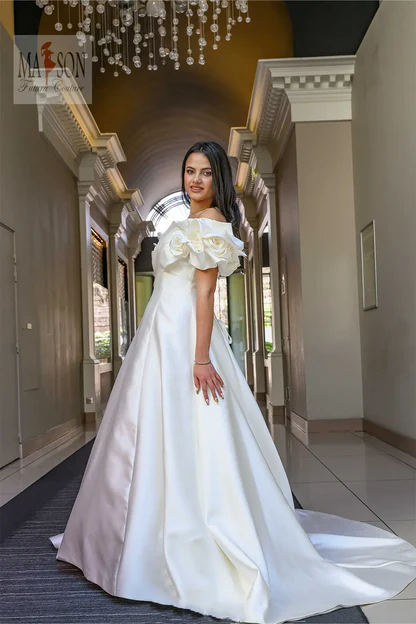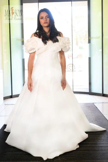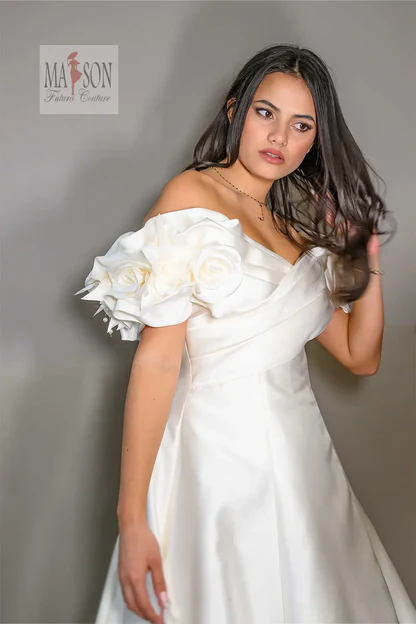 Laissez-vous sublimer par cette somptueuse robe de mariée trapèze à la coupe royale, confectionnée dans un satin duchesse au tombé impeccable. Son encolure bateau dévoile délicatement les épaules, tandis que ses manches spectaculaires, ornées de grandes fleurs sculpturales, apportent une touche romantique et couture irrésistible. Parfaite pour une mariée en quête de grâce et d’originalité, cette création allie raffinement intemporel et détails audacieux pour un effet inoubliable.