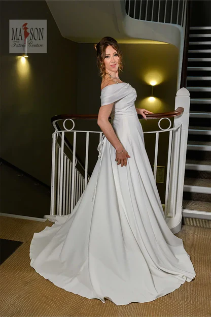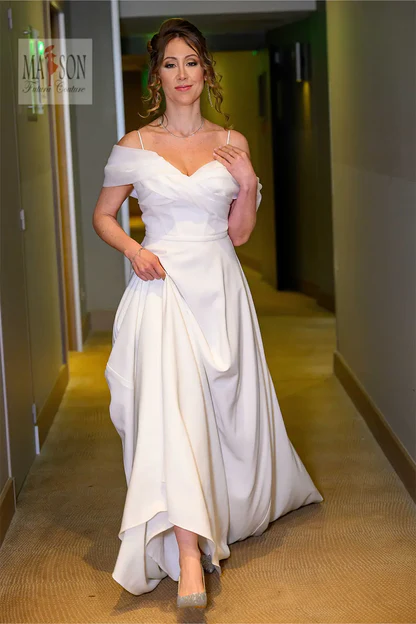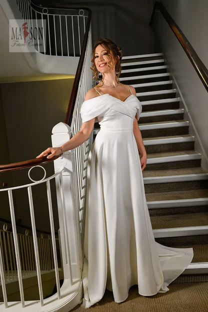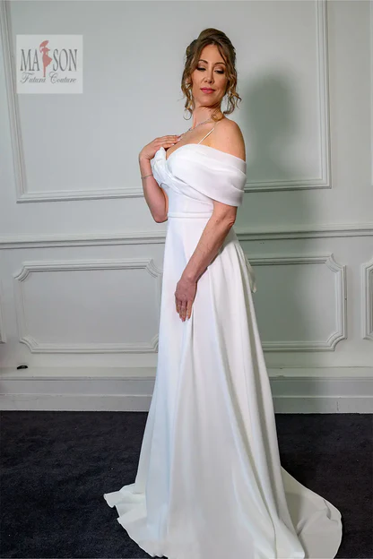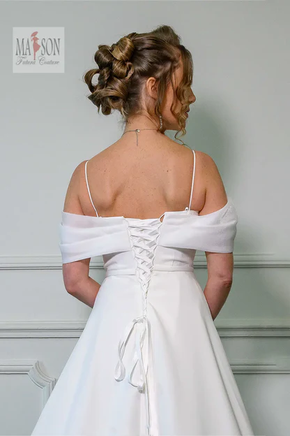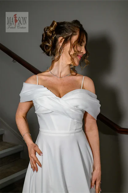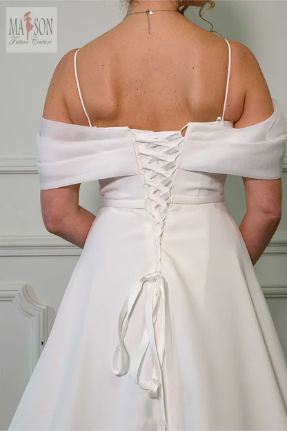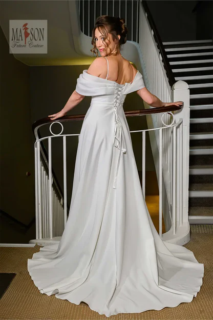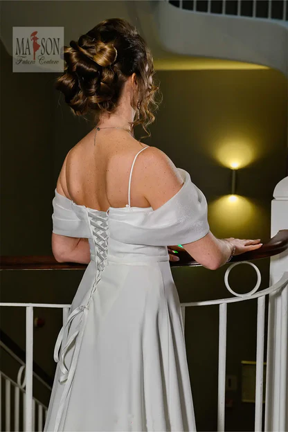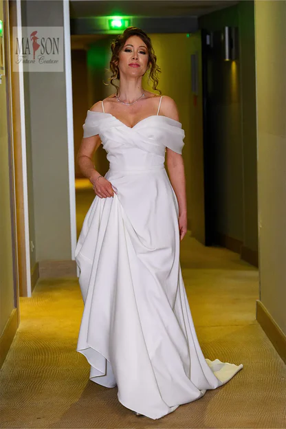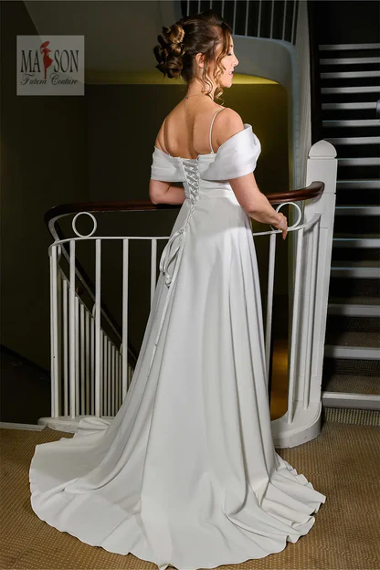 Féminine et majestueuse, cette robe de mariée longue séduit par sa fluidité et sa grâce naturelle. Sa coupe trapèze met en valeur la silhouette tout en légèreté, tandis que ses fines bretelles contrastent élégamment avec des épaules délicatement dénudées, soulignées par un drapé croisé raffiné. Une allure romantique et moderne, idéale pour une mariée qui rêve d’un style à la fois doux, fluide et intemporel.