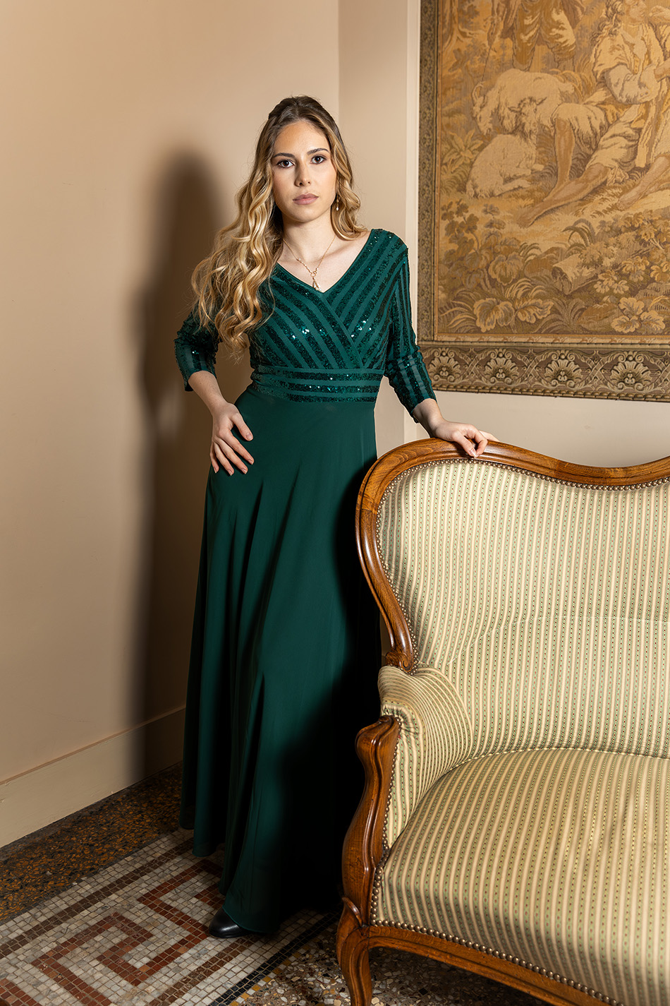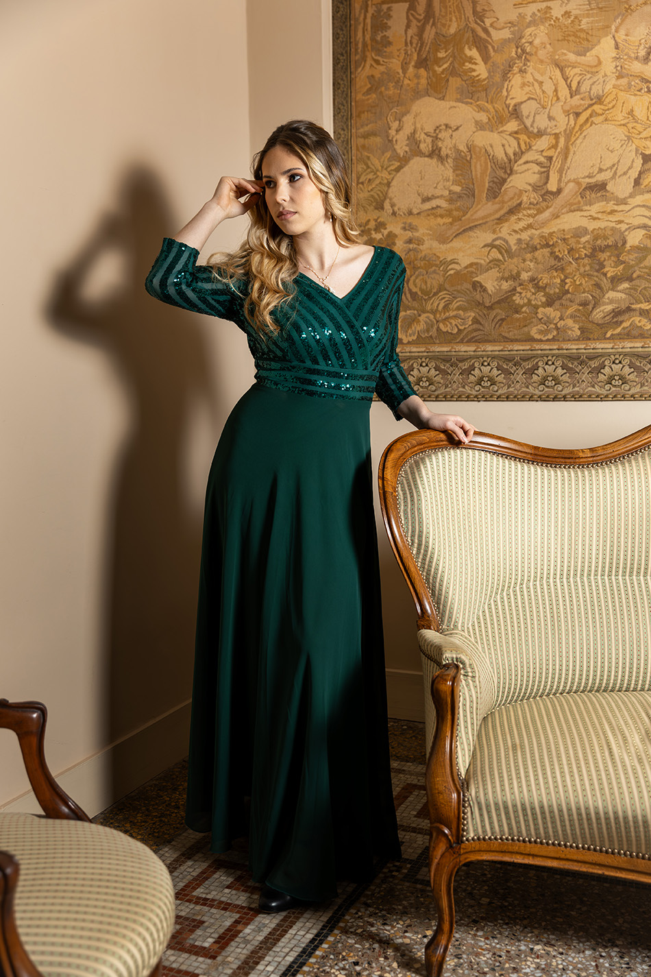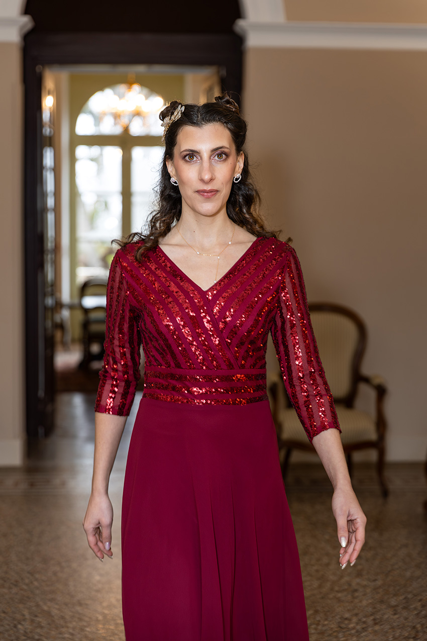 Les manches trois quarts ajoutent une note de retenue élégante à cette robe de soirée cache-cœur. Elles couvrent les bras avec grâce et apportent une dimension intemporelle. C’est le détail qui fait d’Éveil de Désir un choix parfait pour les femmes qui préfèrent la sobriété au décolleté prononcé, sans renoncer à l’allure.