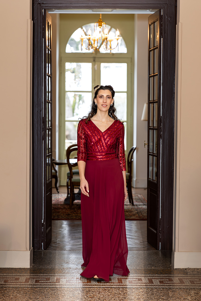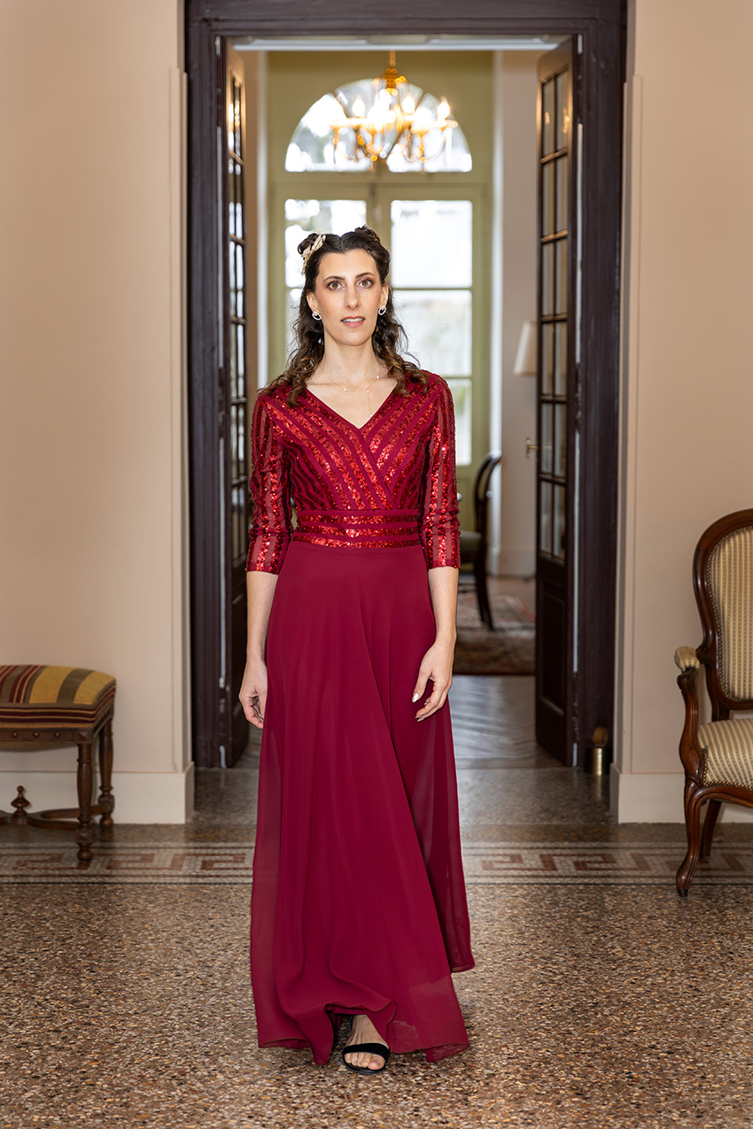 Éveil de Désir associe deux matières complémentaires. Le lycra pailleté apporte un éclat scintillant au buste et à la taille. La mousseline de soie, elle, confère à la jupe sa fluidité aérienne. D’ailleurs, ce mélange offre un avantage pratique rare : la robe reste extensible, infroissable et facile d’entretien. En retour, vous portez une pièce lumineuse sans les contraintes habituelles des robes de cérémonie.