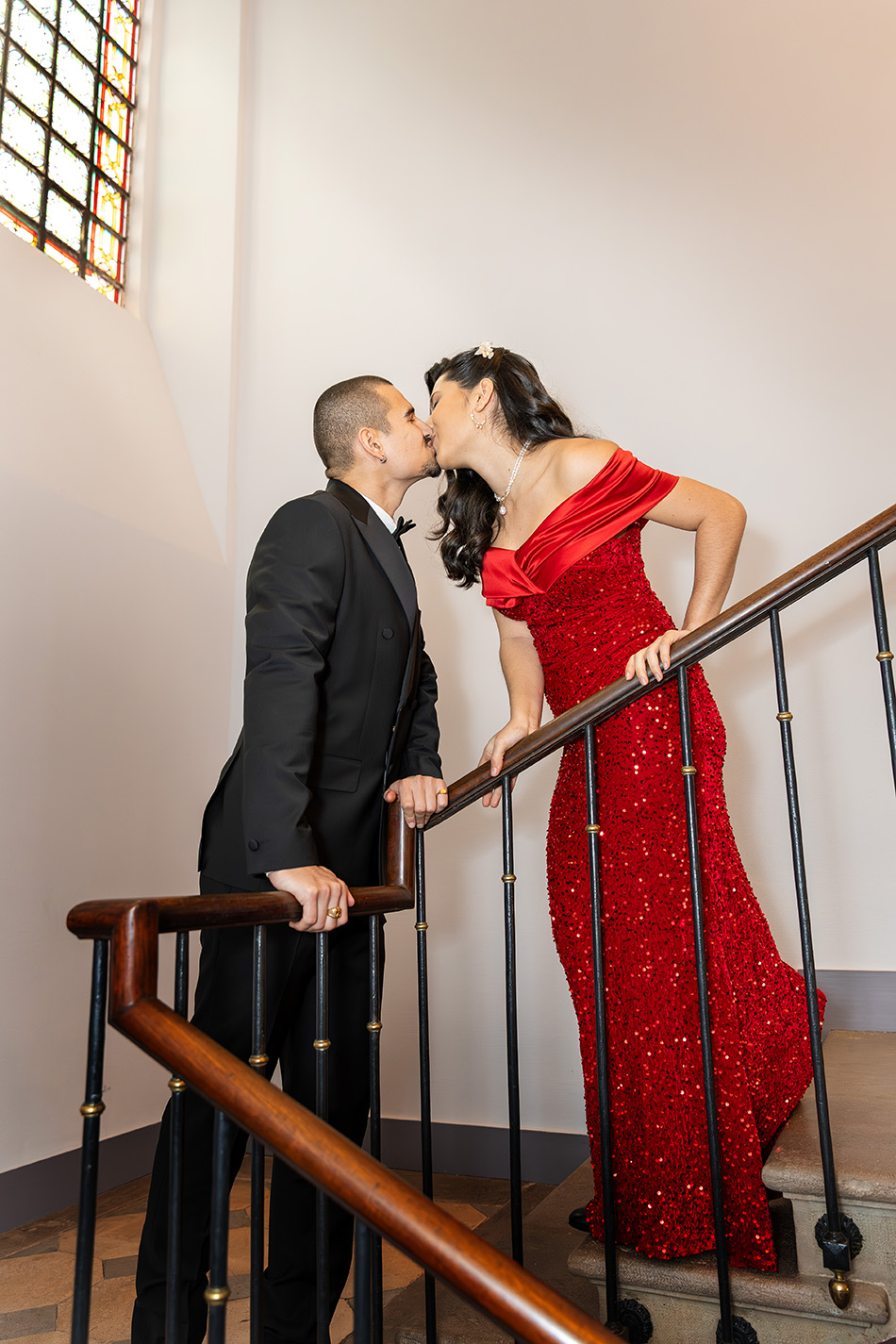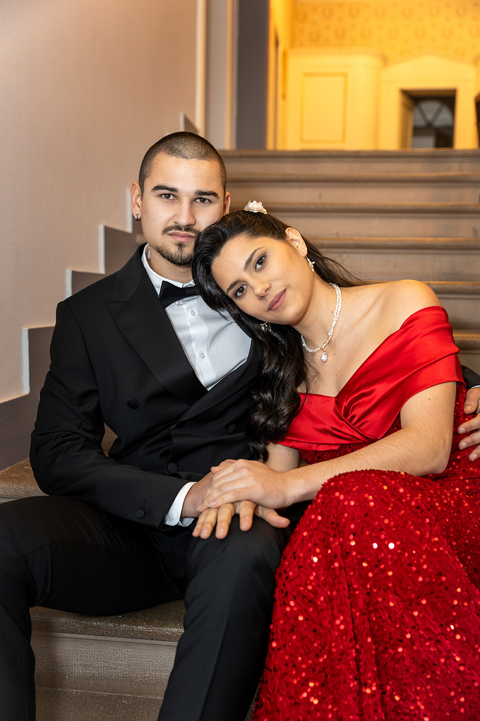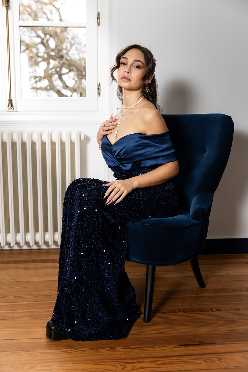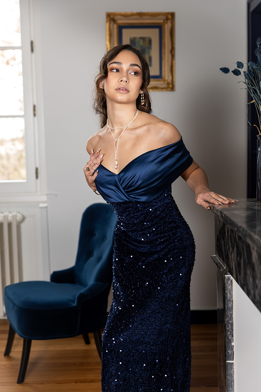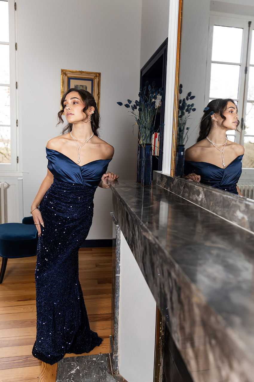 Magie de Désir associe le velours pailleté à la mousseline de soie pour créer un effet de matière riche et profond. Le velours apporte une chaleur visuelle et une texture que la main reconnaît immédiatement. Les paillettes intégrées au tissu diffusent un scintillement discret, sans surcharge. La mousseline, elle, confère à la jupe sa fluidité aérienne. Ce mélange reflète l’exigence d’Albertine dans la sélection de chaque tissu au sein de son atelier sur mesure.