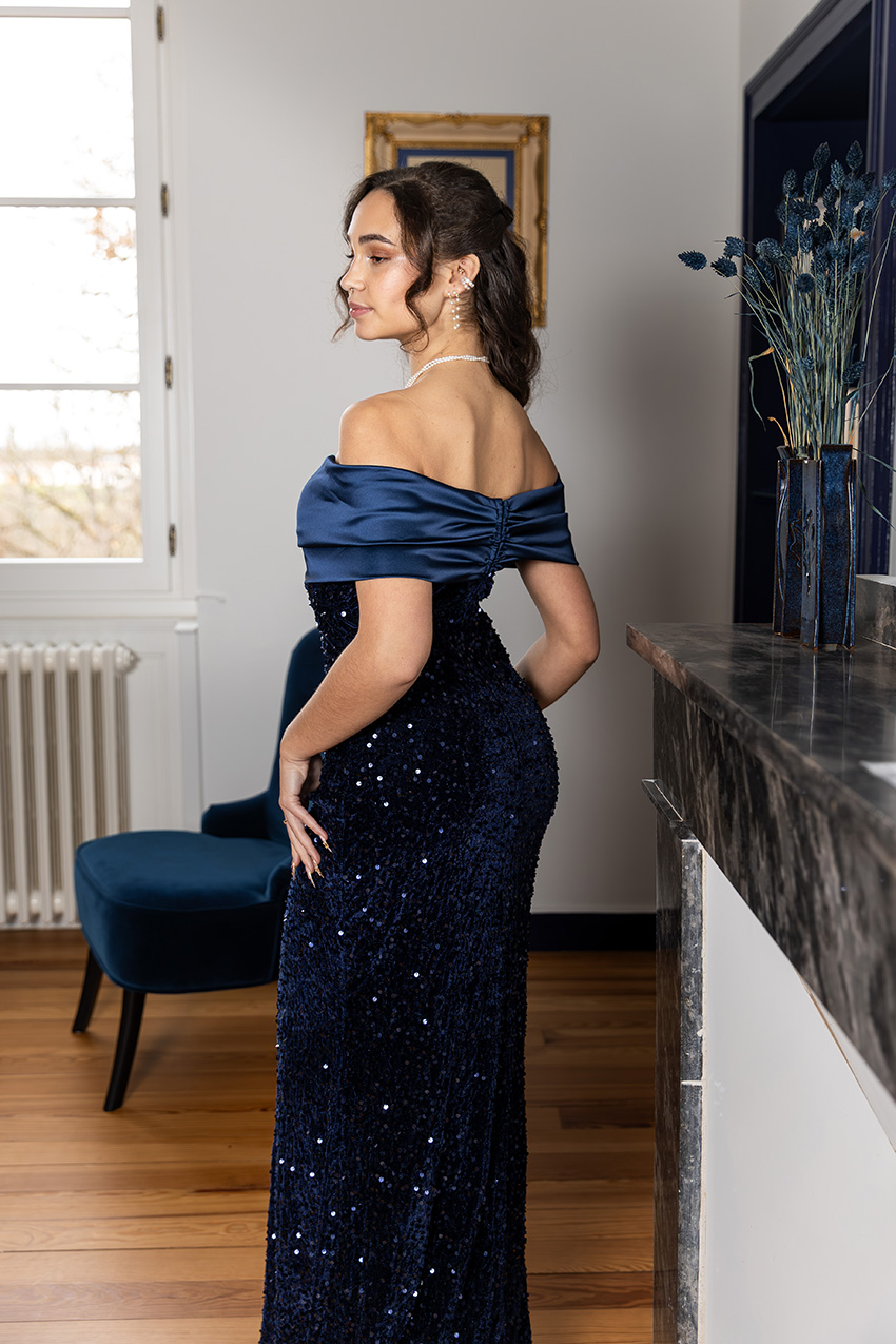 Vous cherchez une robe qui mêle texture, éclat et fluidité dans une seule pièce ? Magie de Désir est cette robe de soirée en velours pailleté à manches tombantes qui transforme chaque apparition en un moment suspendu. Ses reflets chatoyants jouent avec la lumière de façon changeante. C’est une robe qui ne se laisse pas oublier.