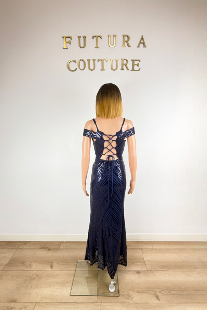Longue jusqu’aux chevilles, en lycra pailleté bleu marine, elle capture chaque éclat de lumière pour illuminer vos pas. Cintrée mais souple grâce à sa matière extensible, elle révèle dans le dos un délicat laçage, détail raffiné qui structure la silhouette et accentue son charme unique.