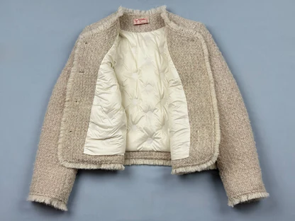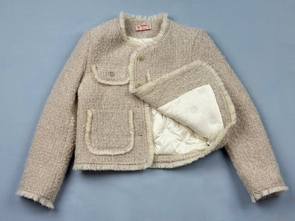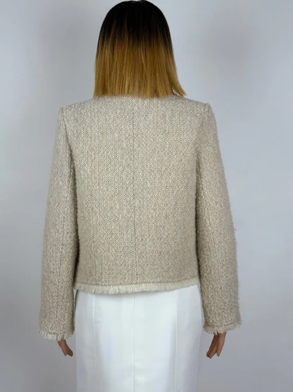 Veste en laine bouillie beige à la texture douce et travaillée, soulignée de finitions frangées sur les poches, le col et le bas de la pièce.